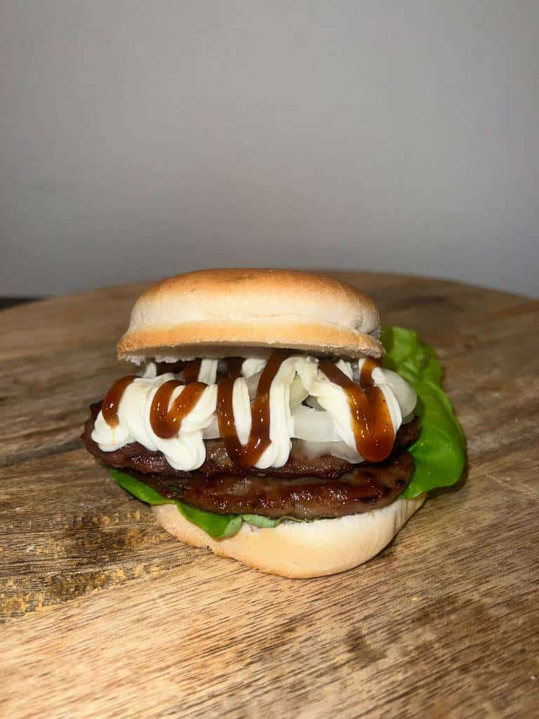 Rundvlees burger met ui en saus naar keuze op een zacht broodje