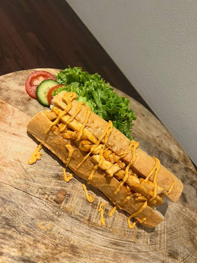 Pittige kipreepjes met romige chilisaus op een hard broodje