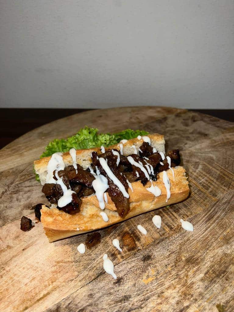 Kipreepjes met ui en champignons en een oriëntaals huisgemaakte saus op een knapperig broodje