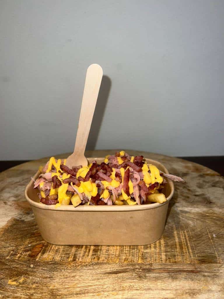 Frites met pulled pork , kaassaus en bacon
