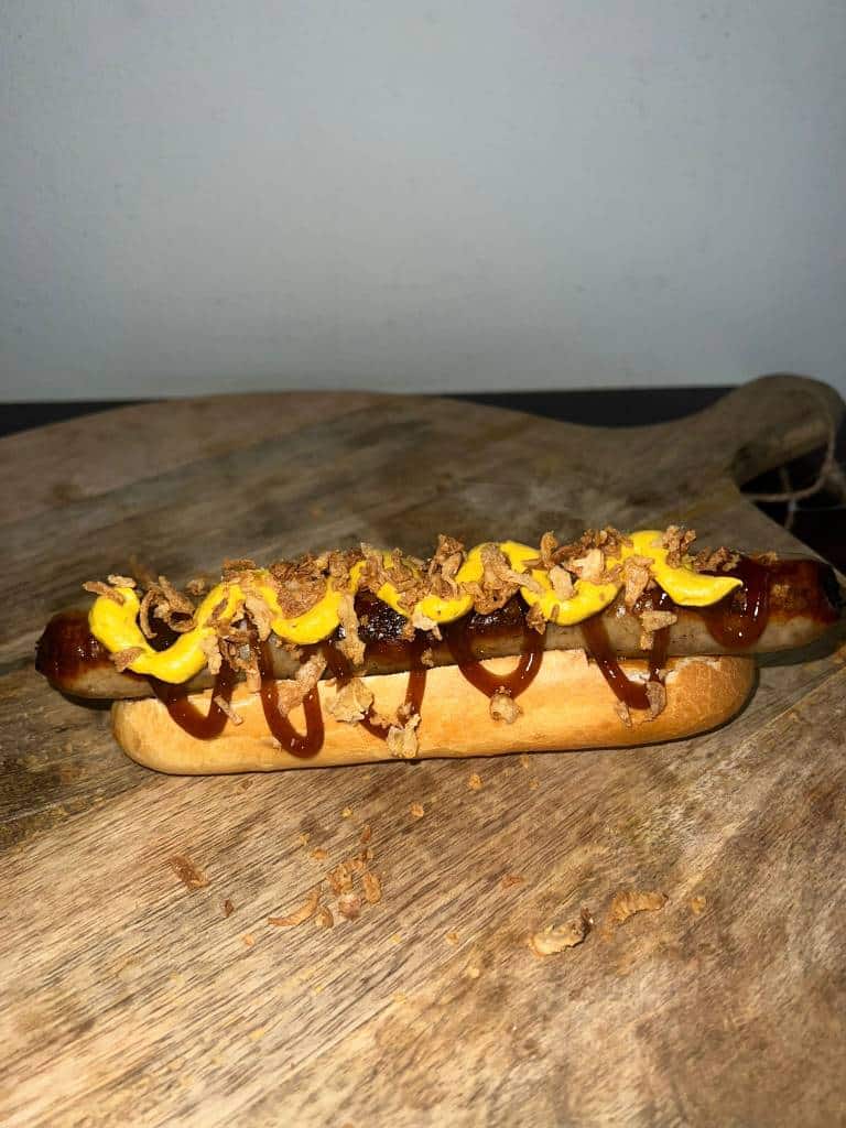 Pistoletje met curryworst, curry, mosterd en gebakken uitjes